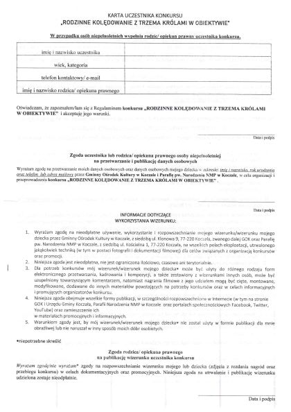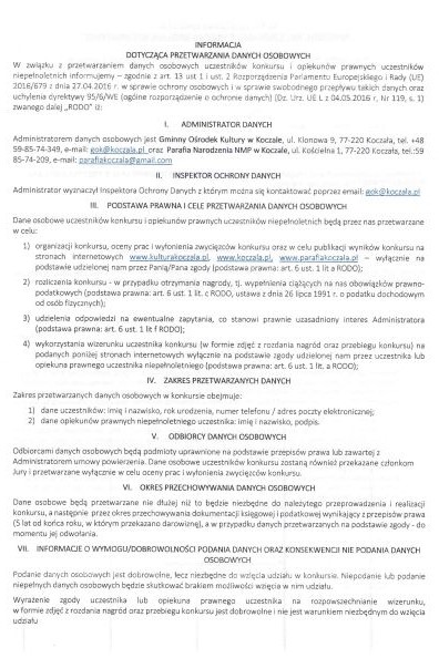 - Organizatorem konkursu jest Gminny Ośrodek Kultury w Koczale i Parafia pod wezwaniem Narodzenia NMP w Koczale.