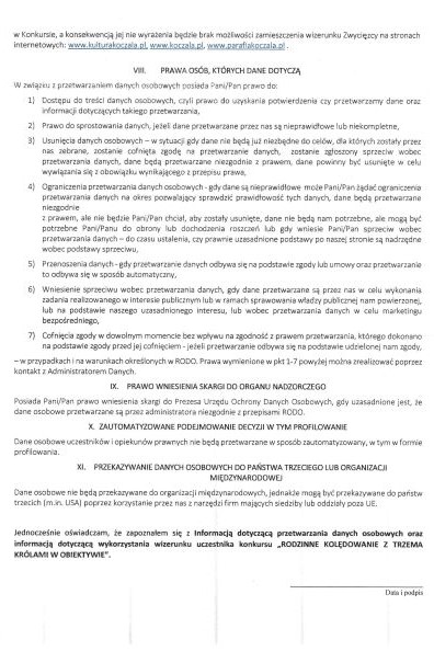 Postanowienia końcowe: Prace przystępujące do konkursu stają się własnością Organizatora. Organizator zastrzega sobie prawo do wykorzystania nadesłanych prac w celach promocyjnych i ich publikacji wraz z podaniem imienia i nazwiska oraz wizerunku autora.