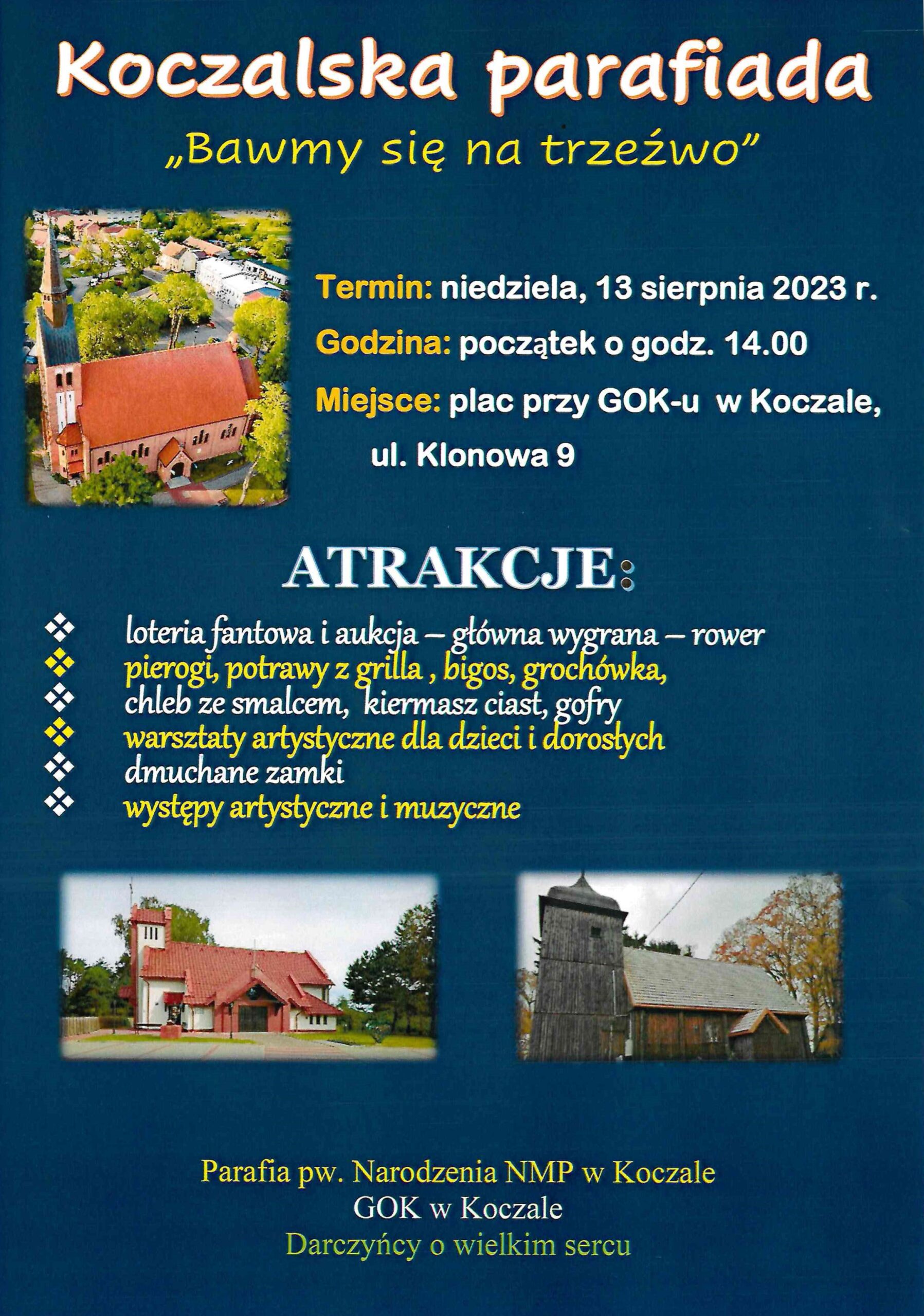 Już 13 sierpnia 2023 roku zapraszamy na moc atrakcji dla dzieci i dorosłych podczas „Koczalskiej parafiady”. Celem jest wykonanie w koczalskim kościele parafialnym zamykanego konfesjonału. Nie zabraknie loterii fantowej, aukcji, występów i zabaw dla najmłodszych oraz pyszności przygotowanych przez mieszkańców i Koło Gospodyń Wiejskich „Bielskie Babeczki”.https://www.facebook.com/photo/?fbid=759518619516889&set=pcb.759521552849929