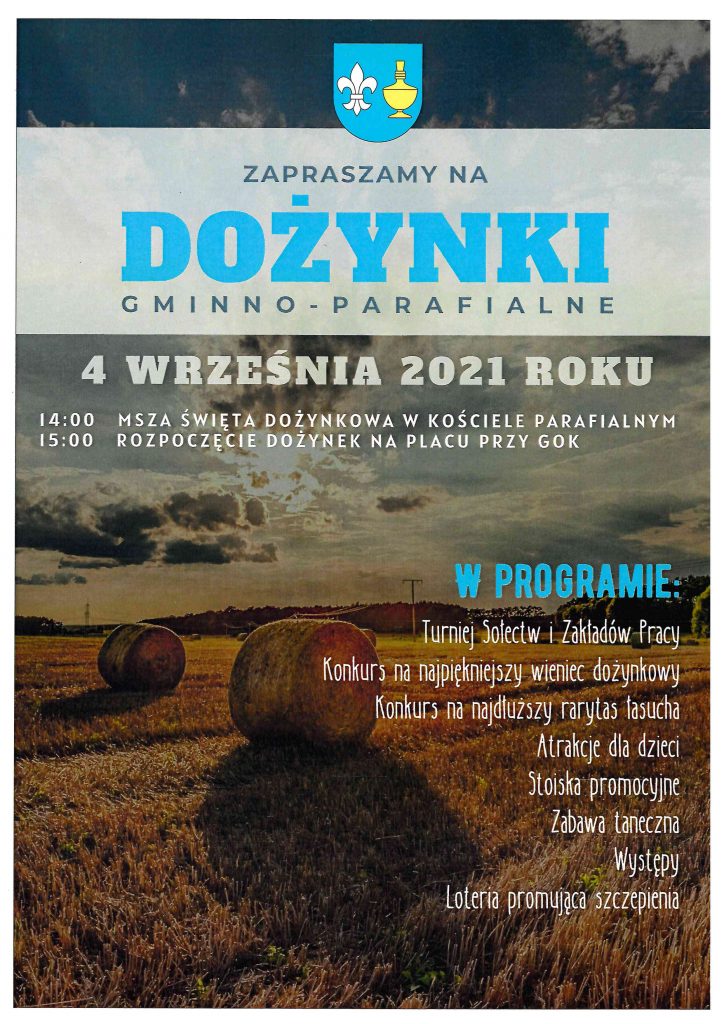 Corocznym zwyczajem mamy zaszczyt zaprosić Państwa do wzięcia udziału w Dożynkach Gminy Koczała, które odbędą się dnia 04 września 2021 roku.