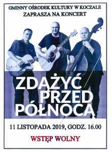 W Gminnym Ośrodku Kultury z okazji 101 rocznicy odzyskania niepodległości przez Polskę zorganizowany został koncert w wykonaniu zespołu Zdążyć przed Północą. Zespół „Zdążyć przed Północą” powstał w 2014 roku jako formacja związana z nurtem twórczości poetyckiej i lirycznej. W skład zespołu wchodzą: Grzegorz Radtke – gdańszczanin mieszkający w Malborku – poeta, wokalista i gitarzysta grający też na harmonijce ustnej, który od wielu lat zajmuje się poezją śpiewaną; Mariusz Wilke – znakomity trójmiejski gitarzysta, współpracujący również z grupą „Bez Jacka” i zespołem Smugglersi oraz Tomasz Wiczyński – muzyk kontrabasista, absolwent Akademii Muzycznej w Gdańsku i organizator wielu przedsięwzięć kulturalnych m.in. Pomorskich Dni Kontrabasowych. Dorobek artystyczny grupy to album „Światło”, który ukazał się w październiku 2015 r. oraz płyta „Słowa”, której oficjalna premiera miała miejsce w styczniu 2017 roku. Wstęp na koncert był bezpłatny. Fotografie z koncertu można obejrzeć w galerii i na portalu facebook.