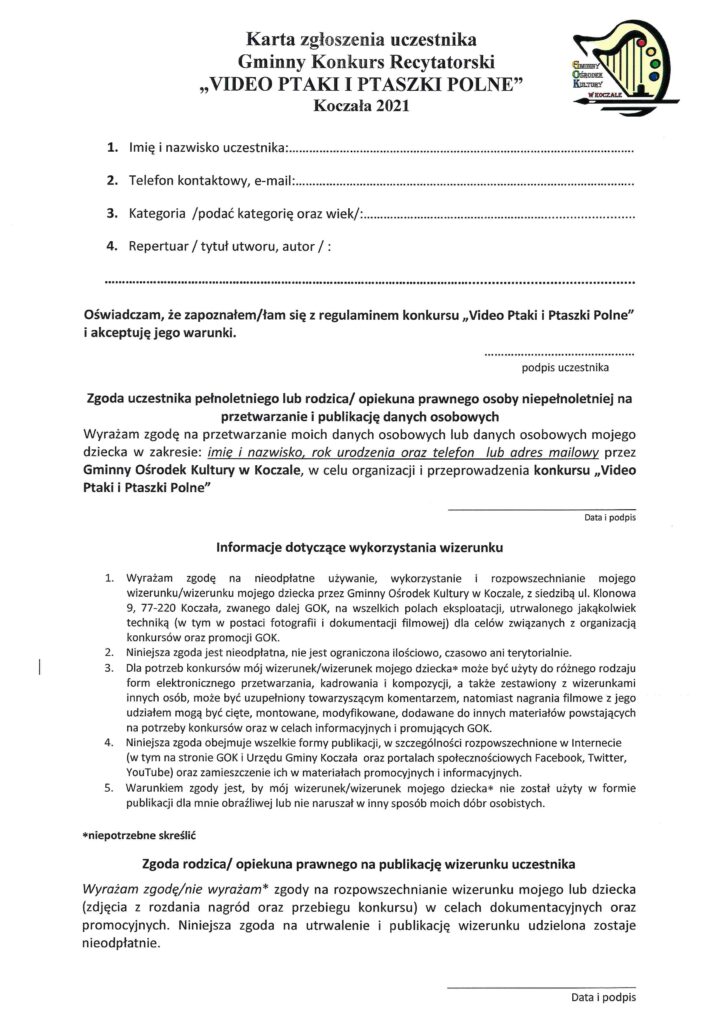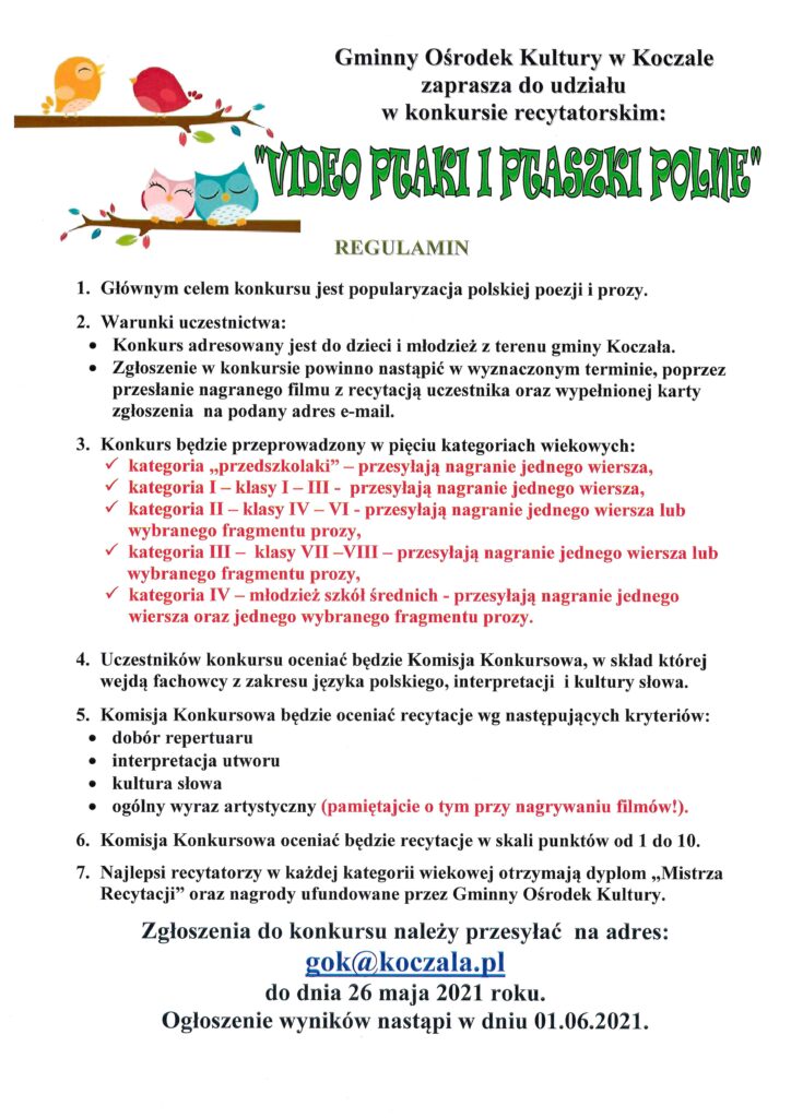 Gminny Ośrodek Kultury w Koczale zaprasza do udziału w kolejnej gminnej edycji konkursu recytatorskiego „PTAKI I PTASZKI POLNE”. Niestety ze względu na sytuację epidemiologiczną instytucje kultury wciąż pozostają zamknięte. Mamy nadzieję, że już po raz ostatni zapraszamy Was do udziału w konkursie recytatorskim „PTAKI I PTASZKI POLNE” w wersji online. Na zgłoszenie czekamy do 26 maja. Wszystkie szczegóły znajdziecie w regulaminie konkursu. Zapraszamy do udziału.