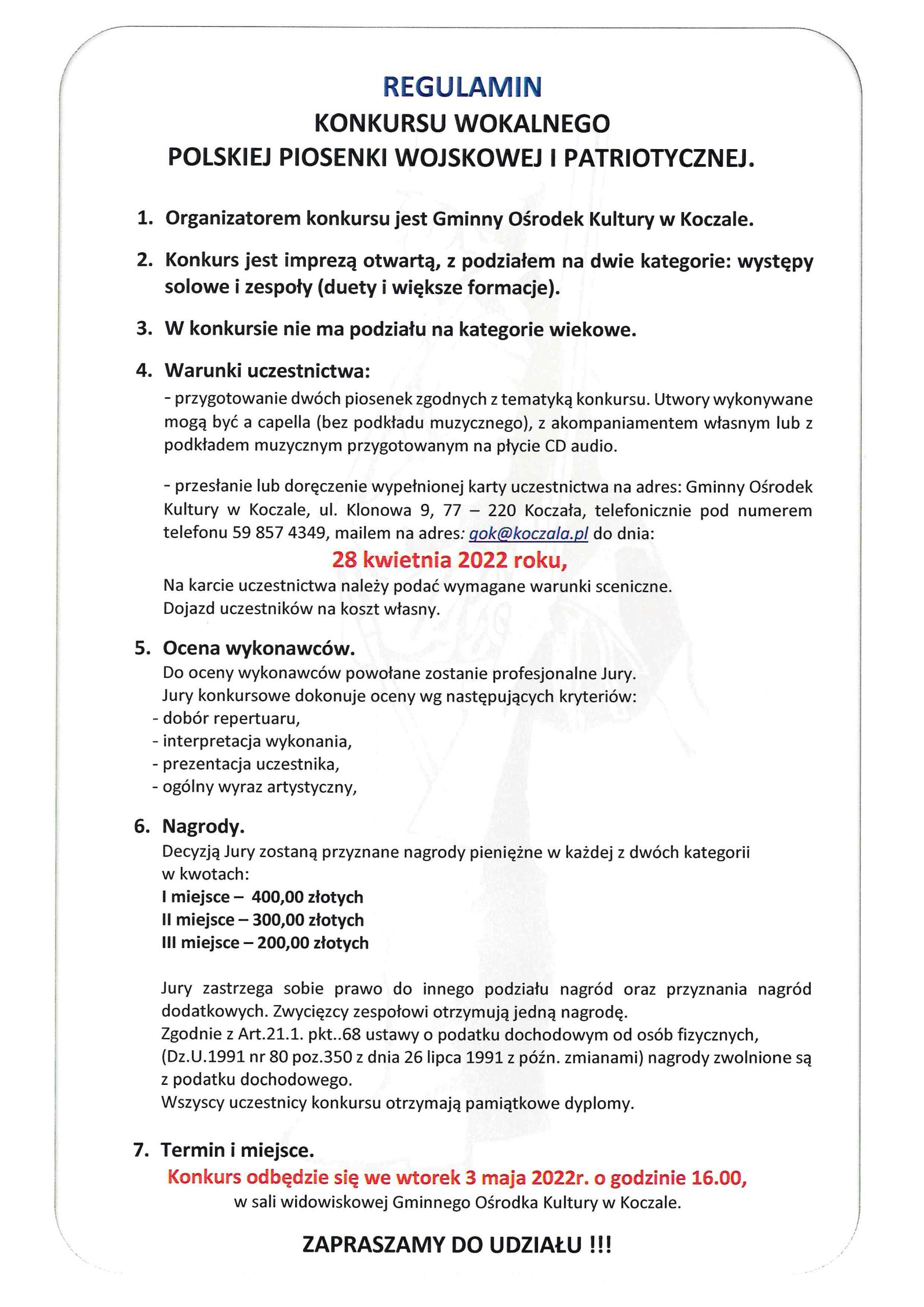 Gminny Ośrodek Kultury w Koczale zaprasza do udziału w konkursie wokalnym „Polskiej Piosenki Wojskowej i Patriotycznej”. Jest nam bardzo miło, że po długiej przerwie spowodowanej pandemią ponownie będziemy mogli się z Wami spotkać 3-go maja. Wszelkie szczegóły znajdziecie w regulaminie konkursu. Zapraszamy do udziału i do zobaczenia.