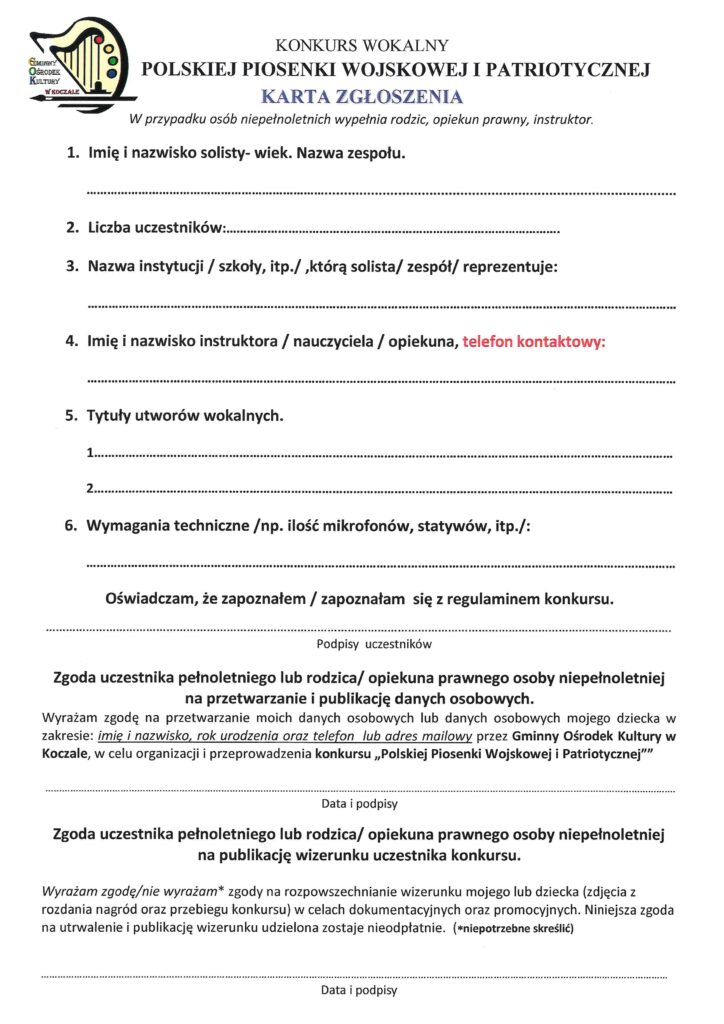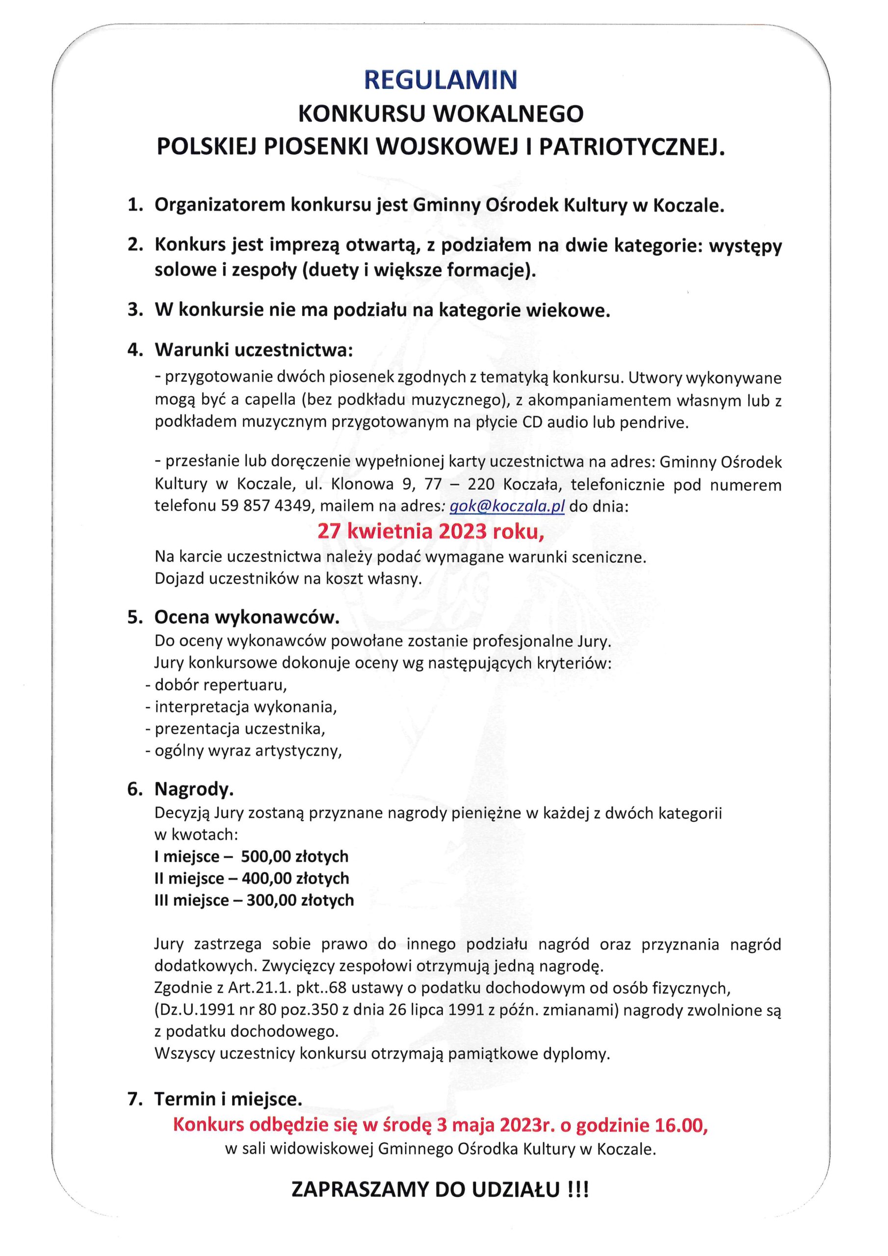 Gminny Ośrodek Kultury w Koczale zaprasza do udziału w konkursie wokalnym „Polskiej Piosenki Wojskowej i Patriotycznej”, który tradycyjnie odbędzie się 3-go maja. Zgłoszenia do konkursu przyjmujemy do dnia 27 kwietnia. Szczegóły w regulaminie konkursu.