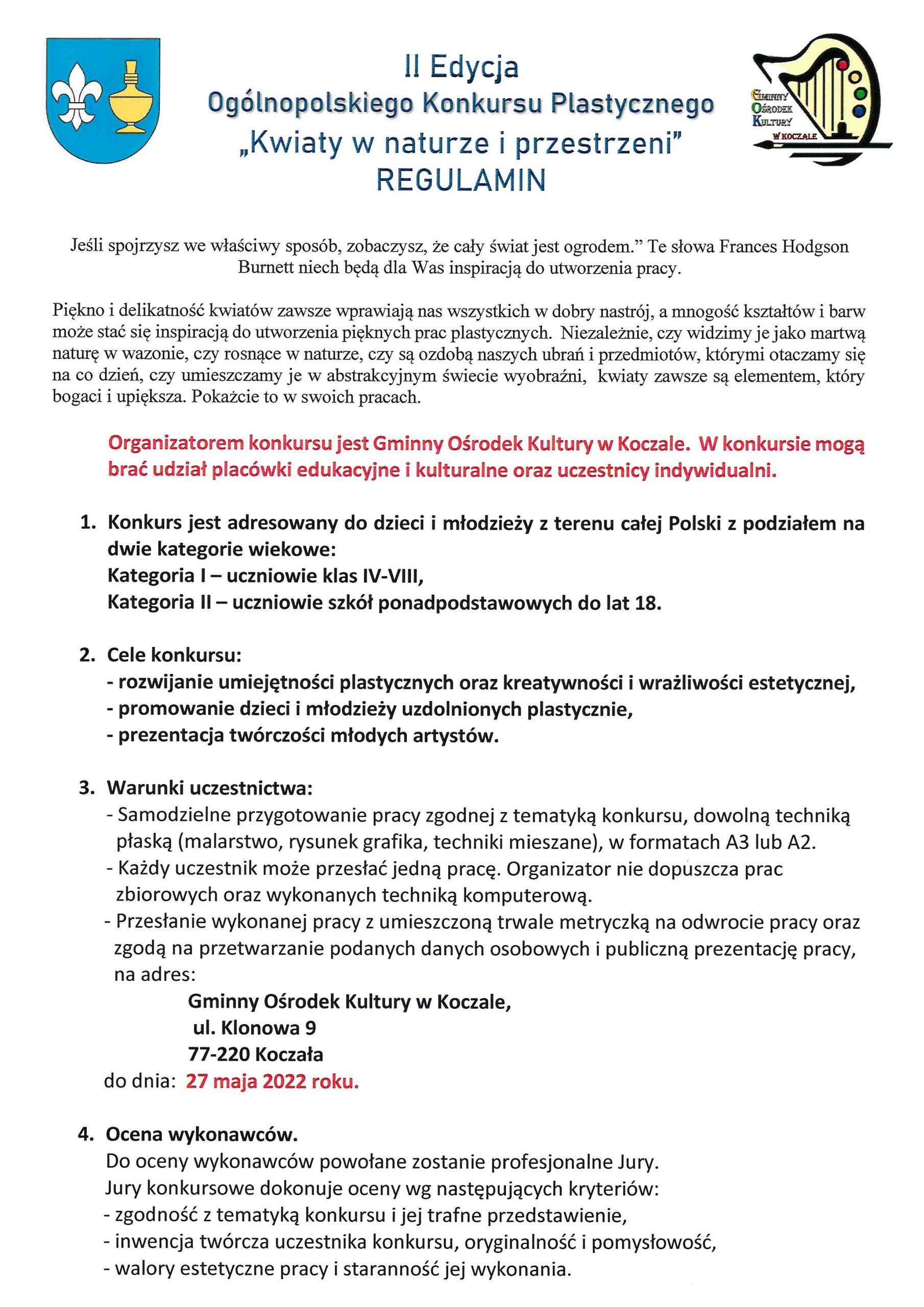 Gminny Ośrodek Kultury w Koczale zaprasza do udziału w II edycji konkursu plastycznego „Kwiaty w naturze i przestrzeni” . Na Wasze prace czekamy do 27 maja, więc pędzle w dłoń. Szczegóły w regulaminie konkursu.
