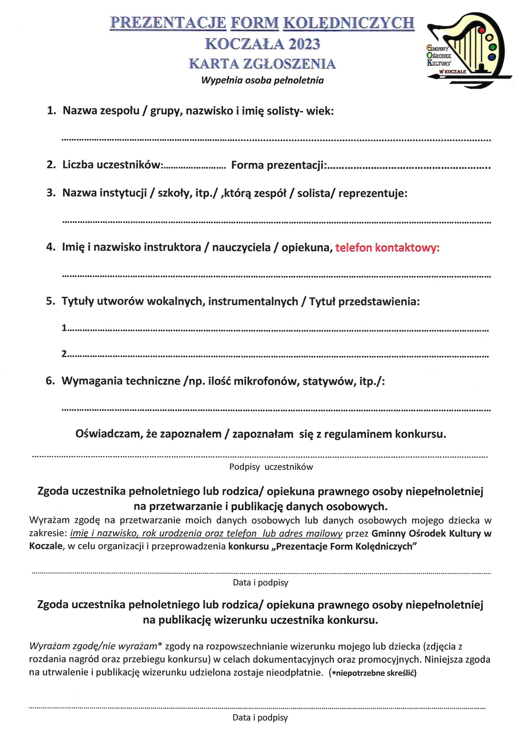 Gminny Ośrodek Kultury w Koczale zaprasza do udziału w kolejnej edycji Prezentacji Form Kolędniczych Koczała 2023, które odbędą się już 14 stycznia 2023roku. Na zgłoszenia czekamy do 10 stycznia. Zapraszamy.