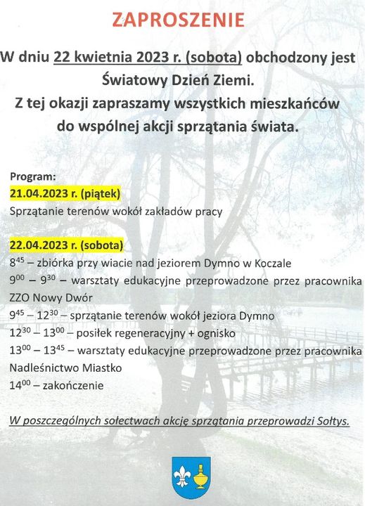 W dniu 22 kwietna obchodzony będzie Światowy Dzień Ziemi z tej okazji zapraszamy wszystkich mieszkańców do wspólnej akcji sprzątania świata. Szczegóły na plakacie.
