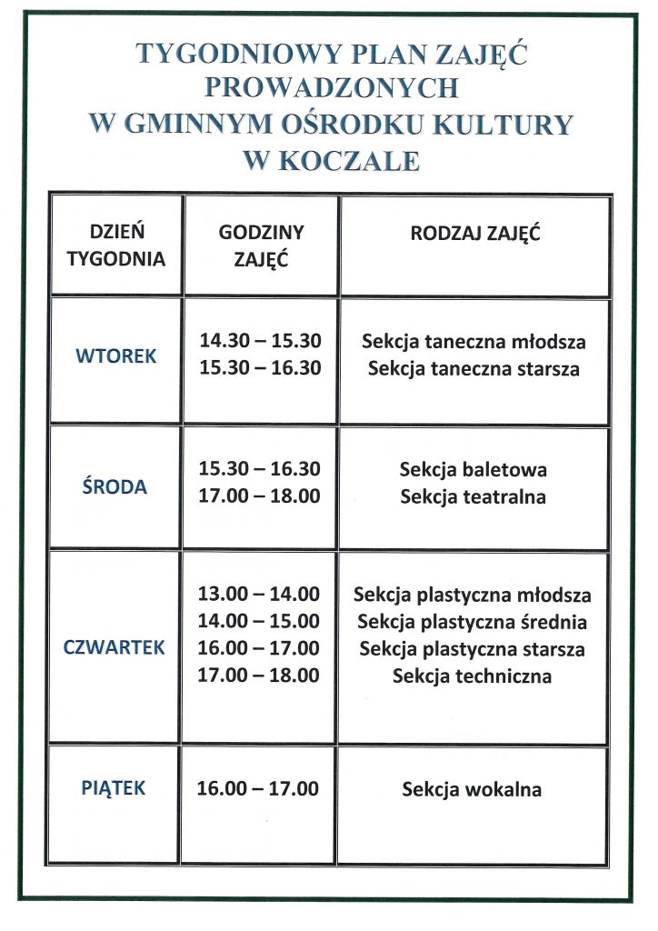 Zapraszamy do zapoznania się z tygodniowym planem zajęć prowadzonych w Gminnym Ośrodku Kultury w Koczale.