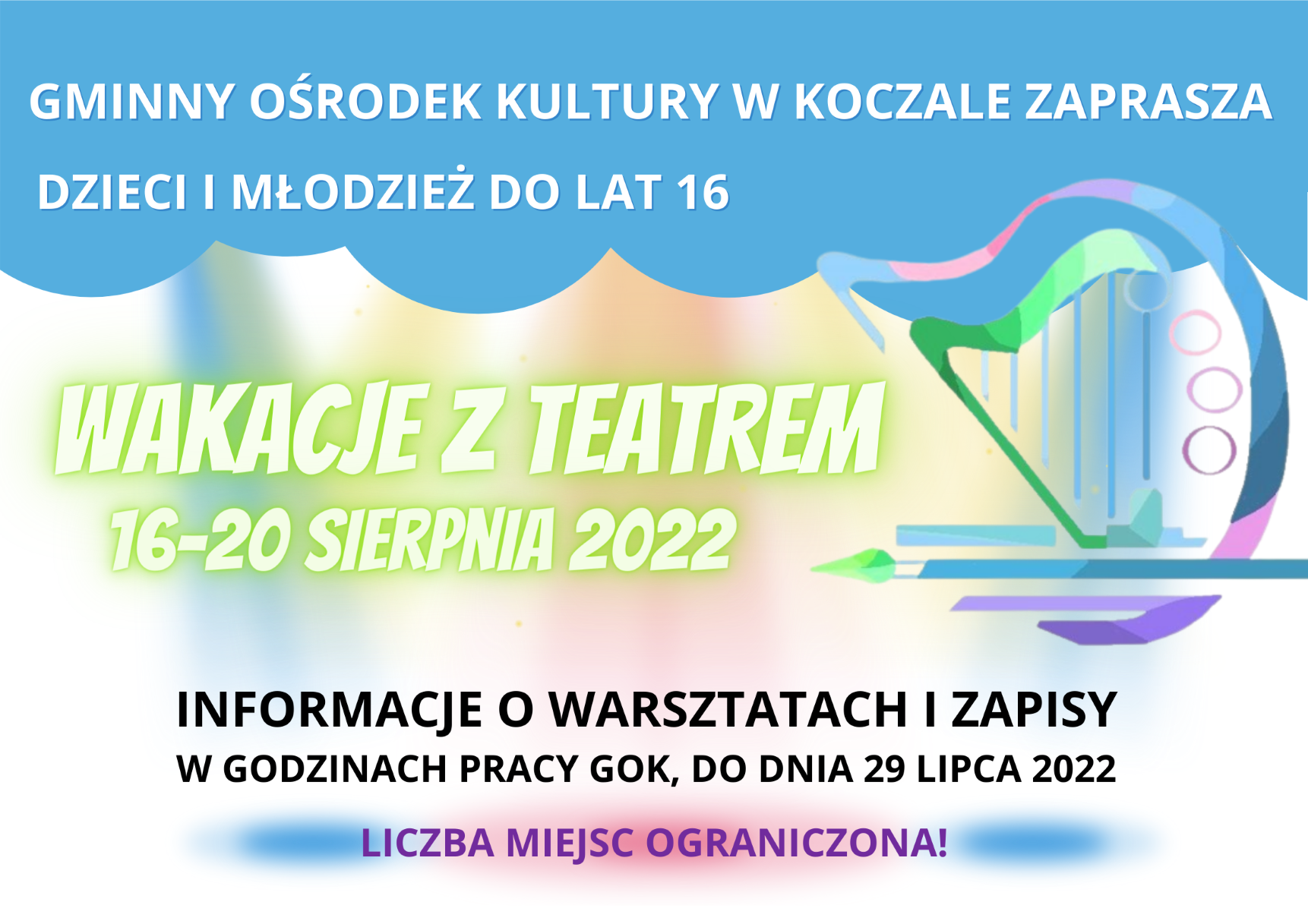 Gminny Ośrodek Kultury w Koczale zaprasza dzieci i młodzież w wieku 6-16 lat na warsztaty „Wakacje z teatrem”. Zapisy oraz informacje dotyczące warsztatów można uzyskać pod numerem telefonu 59 857 4349 w godzinach pracy Gminnego Ośrodka Kultury. Warsztat odbędą się w dniach 16-20 sierpnia. Zapraszamy.