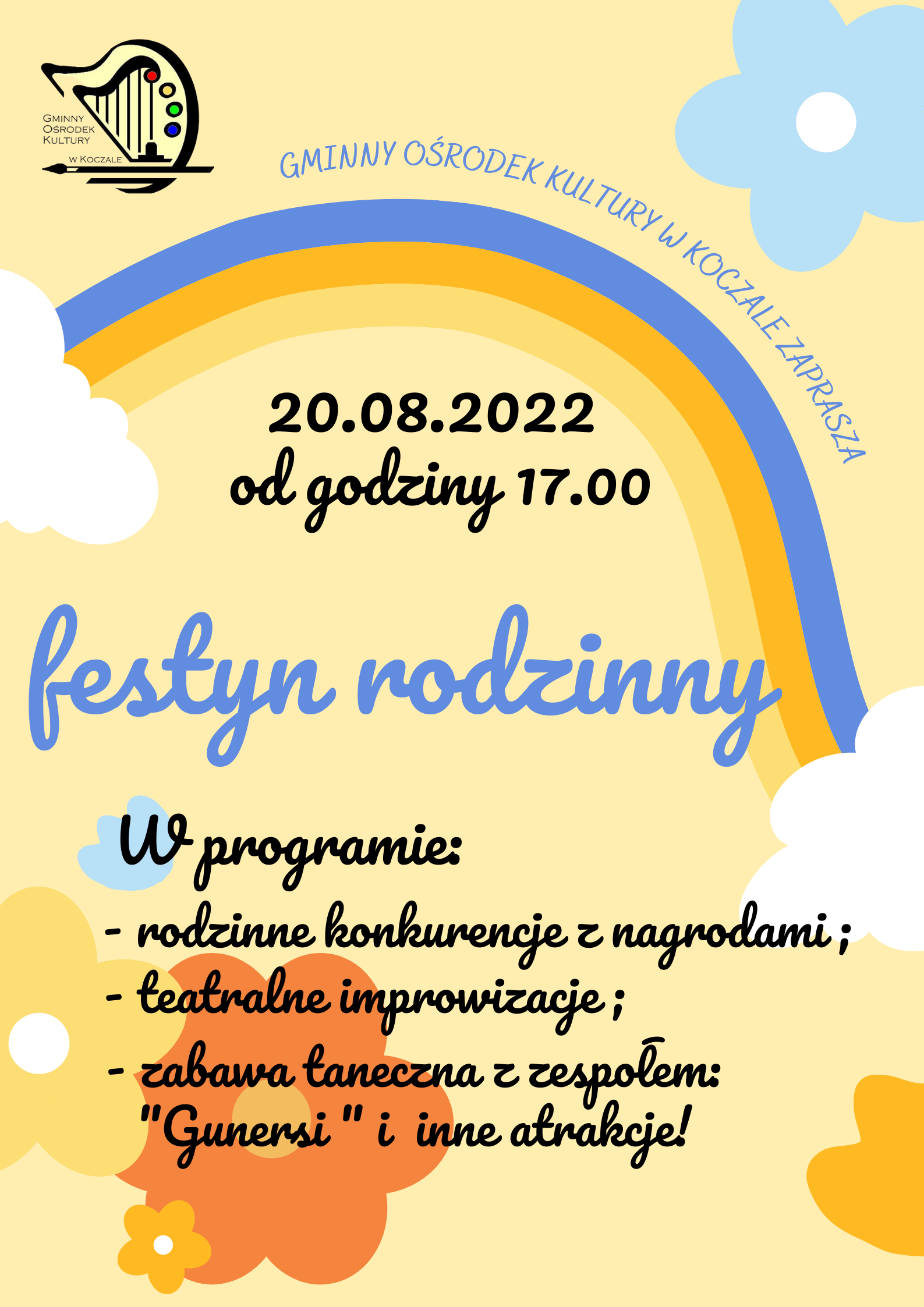 Gminny Ośrodek Kultury w Koczale zaprasza w sobotę 20 sierpnia na festyn rodzinny. W programie rodzinne konkurencje z nagrodami, teatralne improwizacje, zabawa taneczna z zespołem GUNERSI. Start godzina 17.00.