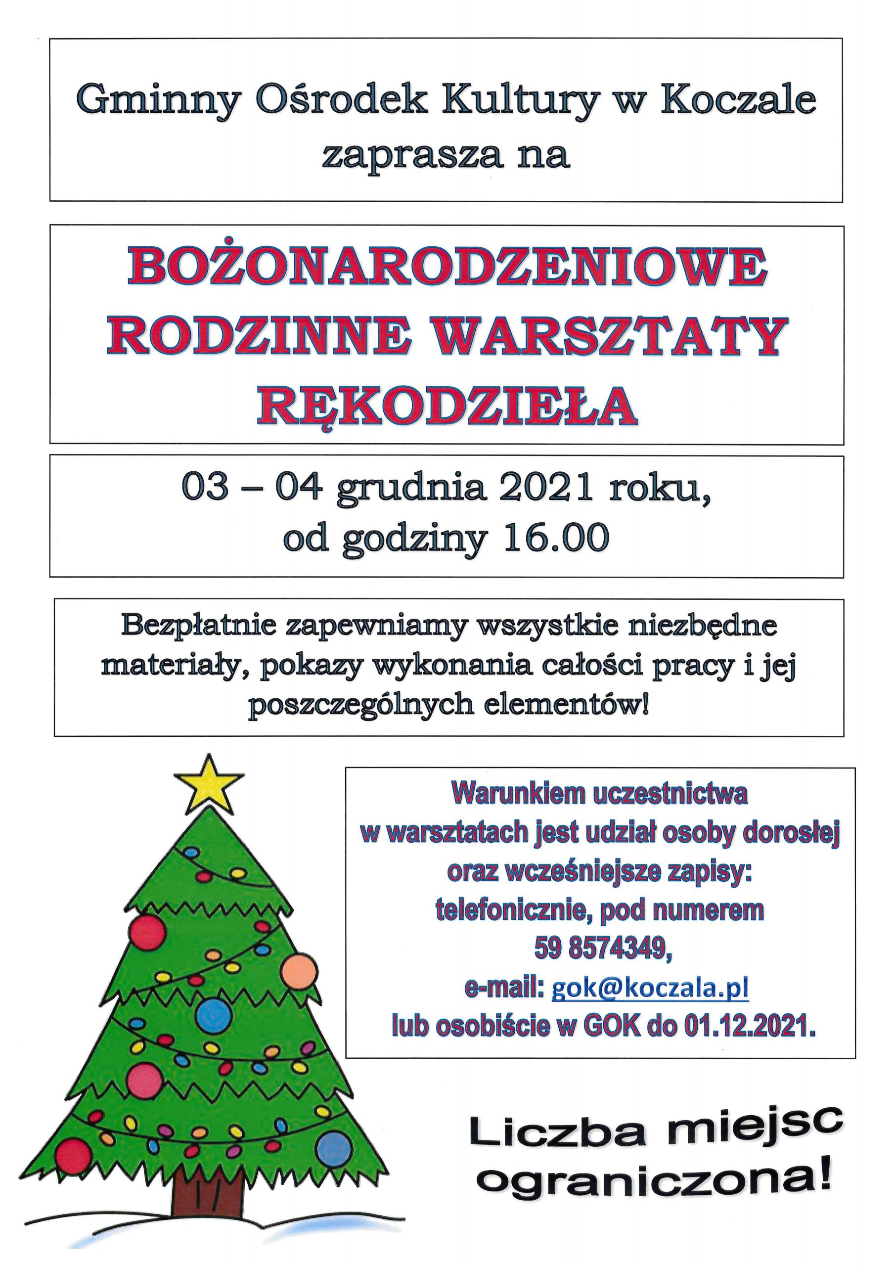 Gminny Ośrodek Kultury w Koczale zaprasza w dniach 03-04 grudnia na BOŻONARODZENIOWE RODZINNE WARSZTATY RĘKODZIEŁA.